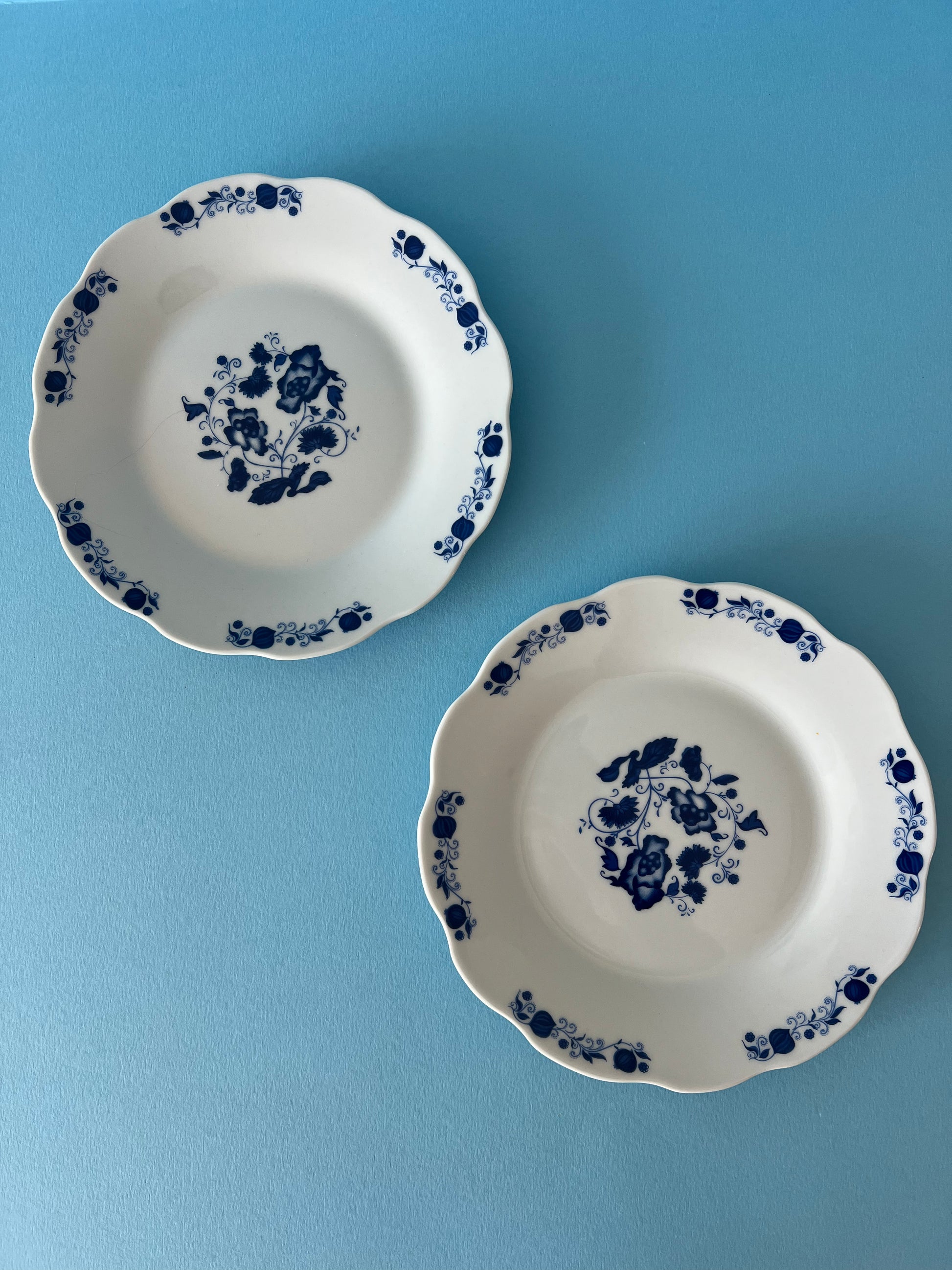 Beautiful vintage Italian blue onion floral side plates. Marked 'Fine Porcellana, selected design by Giordano.'