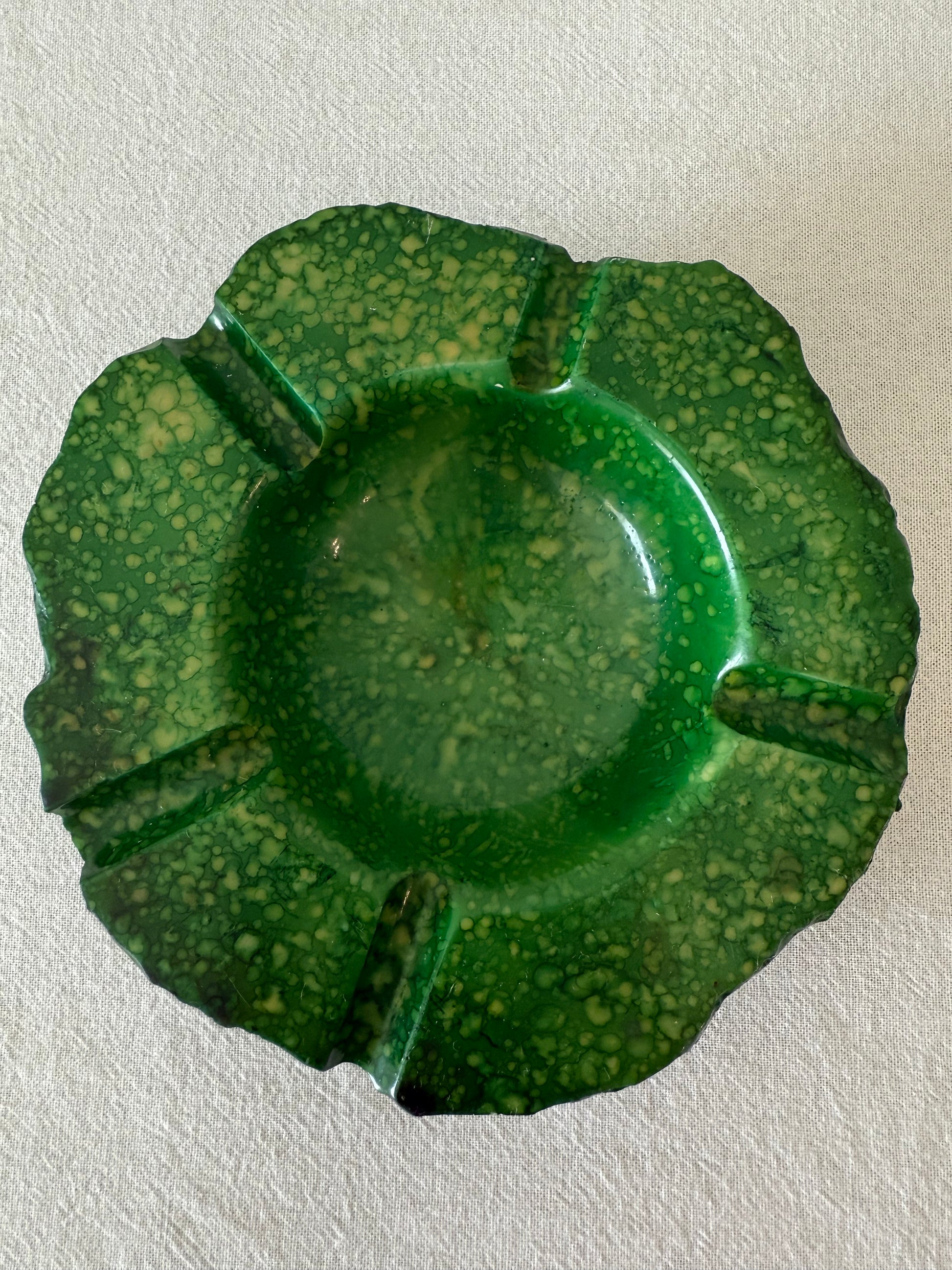 Cool bold green pigmented heavy dish. Perfect as a decorative piece or for keys and coins. Exact material unknown.