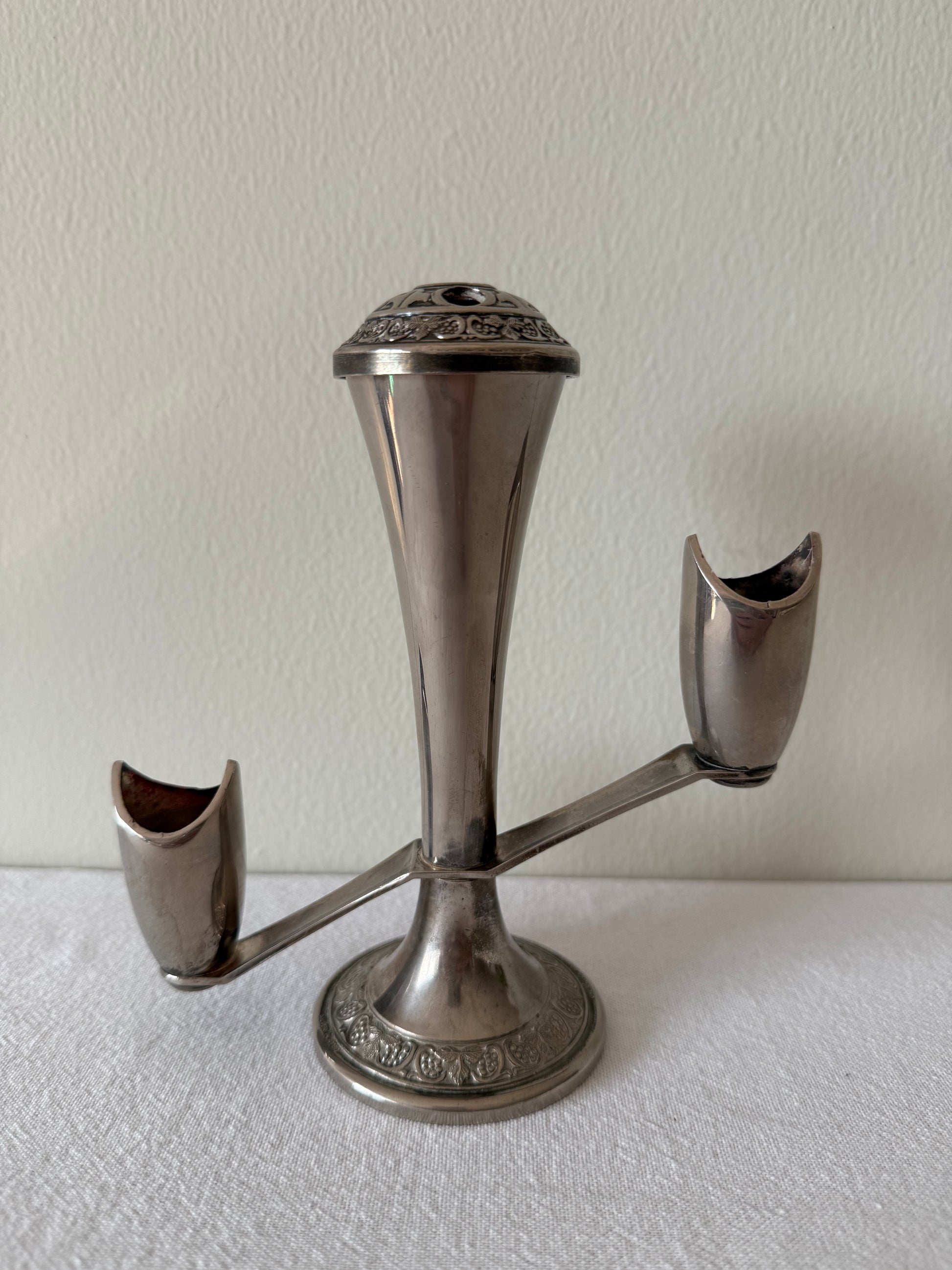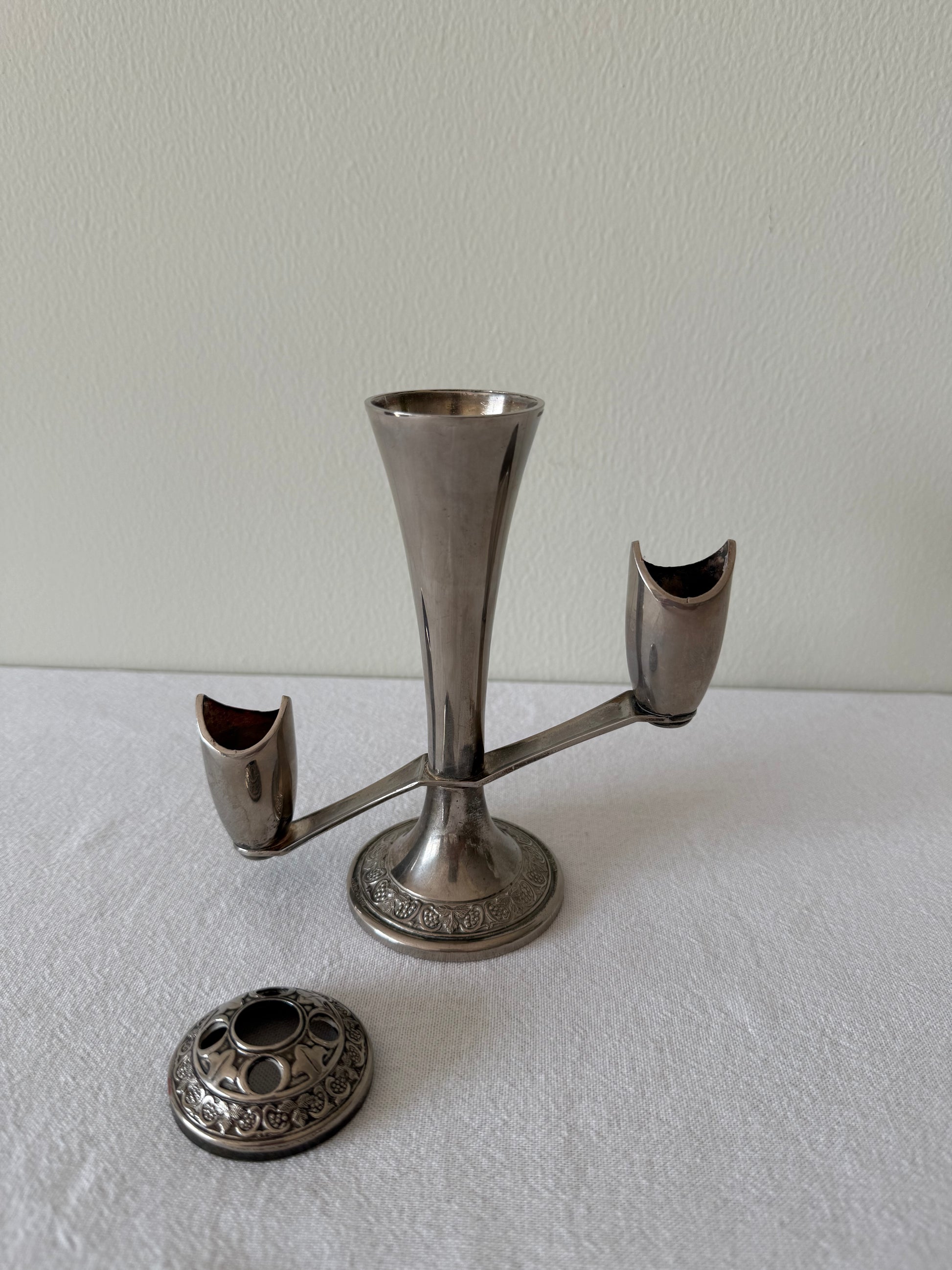 Vintage Grenadier silver plated candle holder for 2-3 taper candles or as a bud vase. Adding a unique vintage charm to your space.