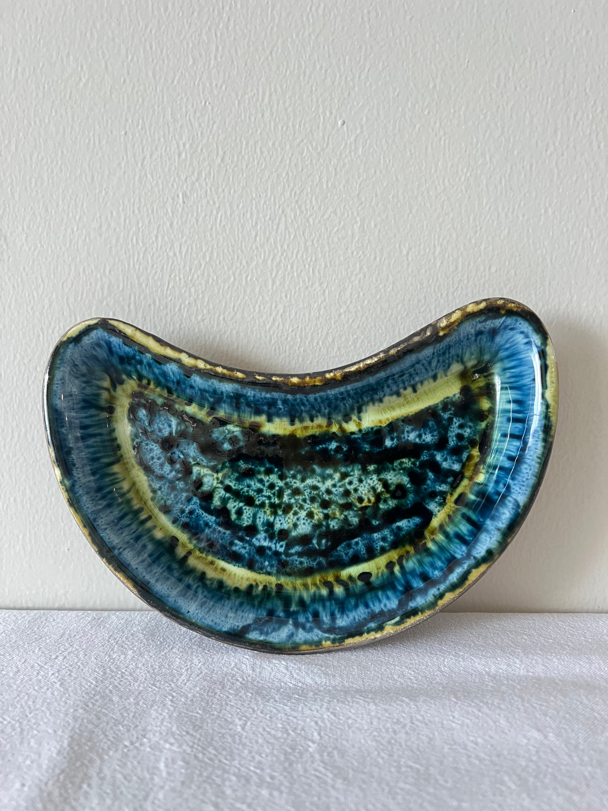 Vintage Welsh Portmadog Pottery dish in a blend of deep blue and lime green glaze. Ideal as a decorative piece, trinket dish, or as a statement piece on a coffee table.