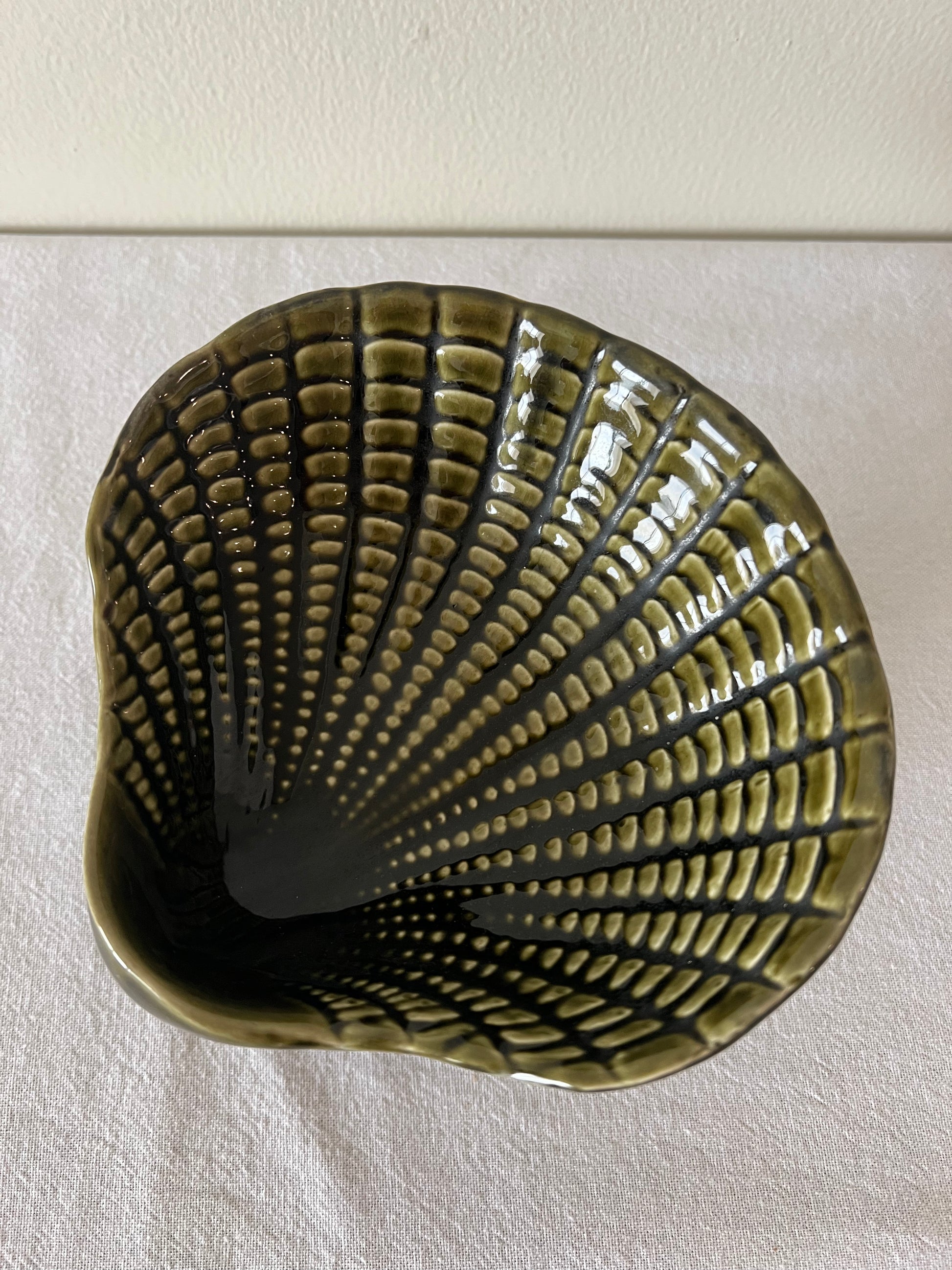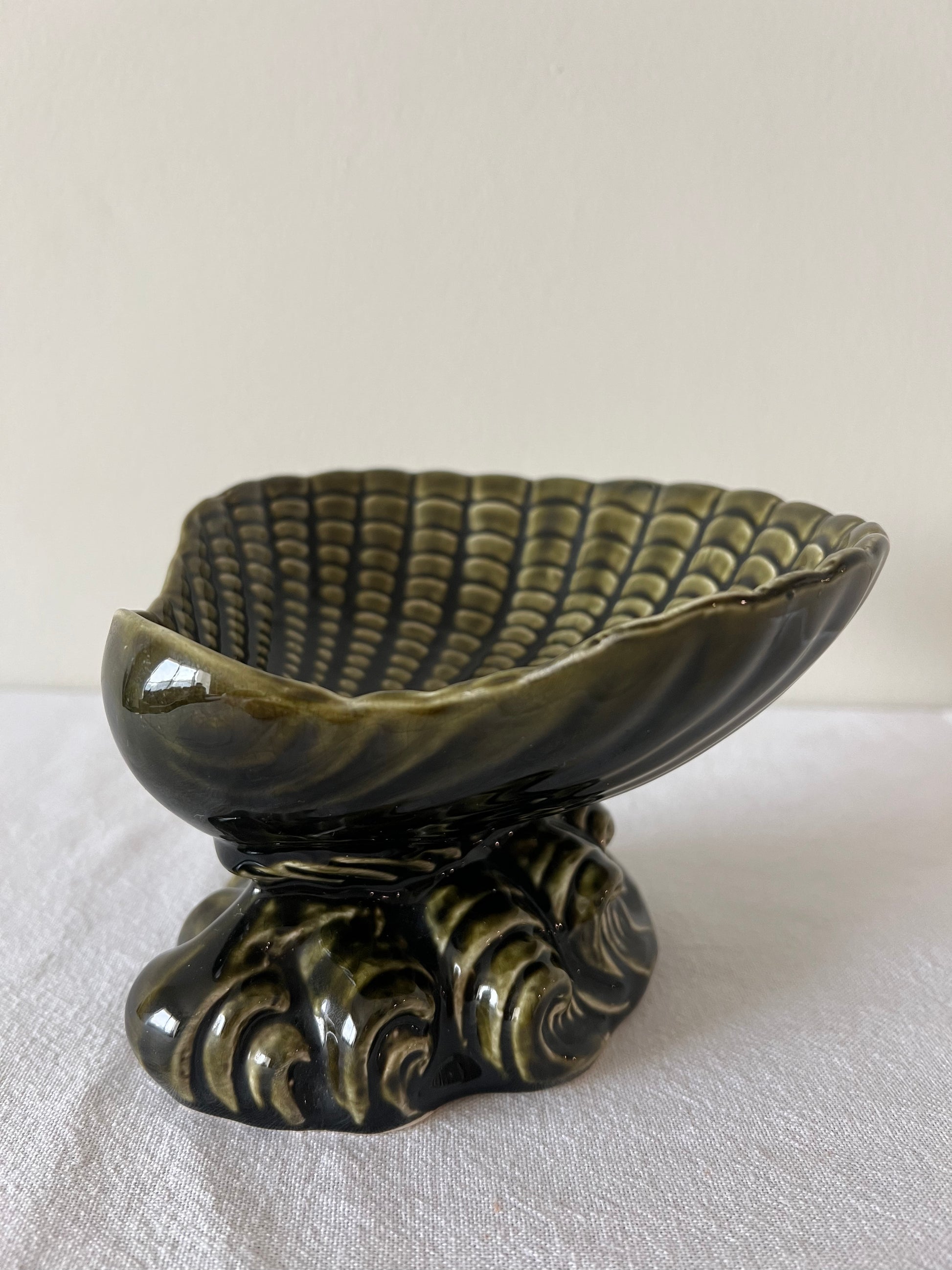 Raised green ceramic shell dish, ideal as a decorative piece or to hold jewellery or small bites.